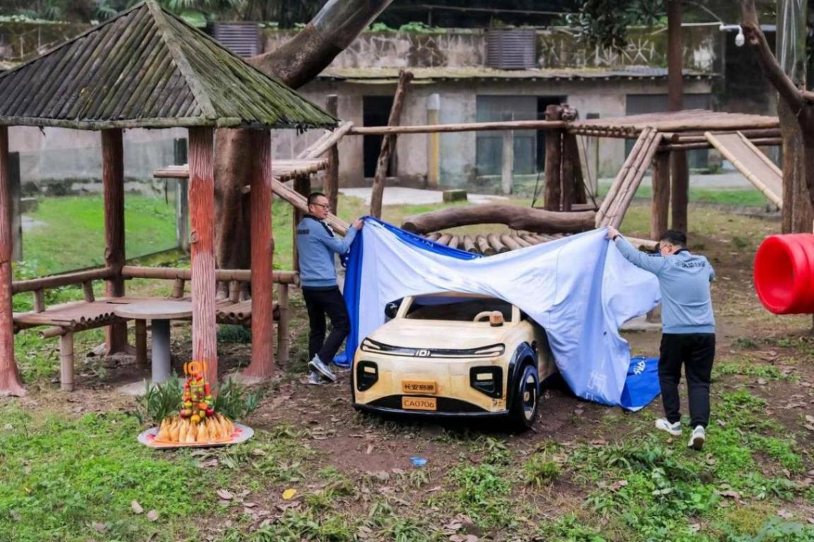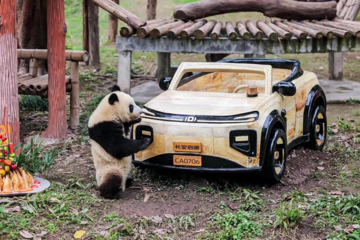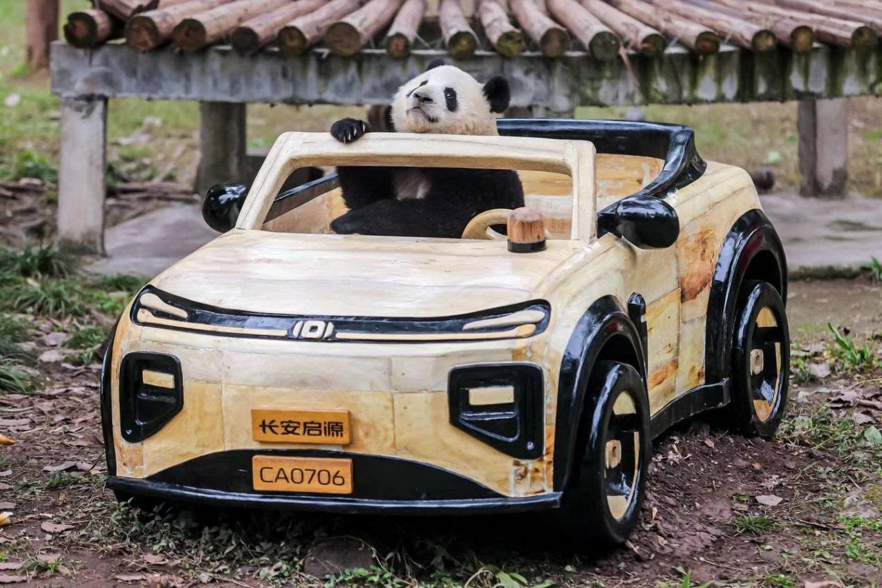 12月30日,重庆动物园熊猫馆。在一众猫粉的见证下,国宝莽灿灿(又名莽小五)现场签收了它的新年礼物——一辆实木材质的全新玩具车,不禁引来现场猫粉们感叹:长安五少又又又换新车啦!