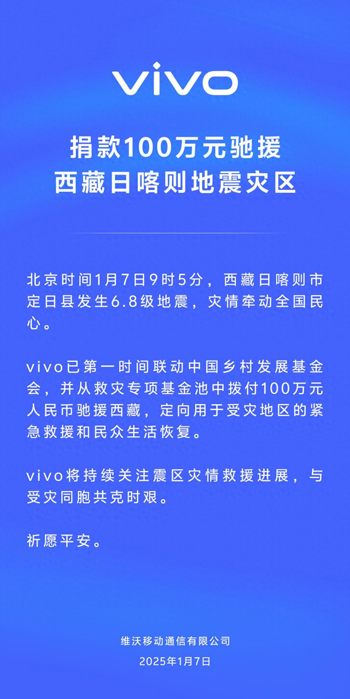 1 月 8 日消息,vivo 昨晚(1 月 7 日)宣布,已第一时间联动中国乡村发展基金会,并从救灾专项基金池中拨付 100 万元人民币驰援西藏,定向用于受灾地区的紧急救援和民众生活恢复。