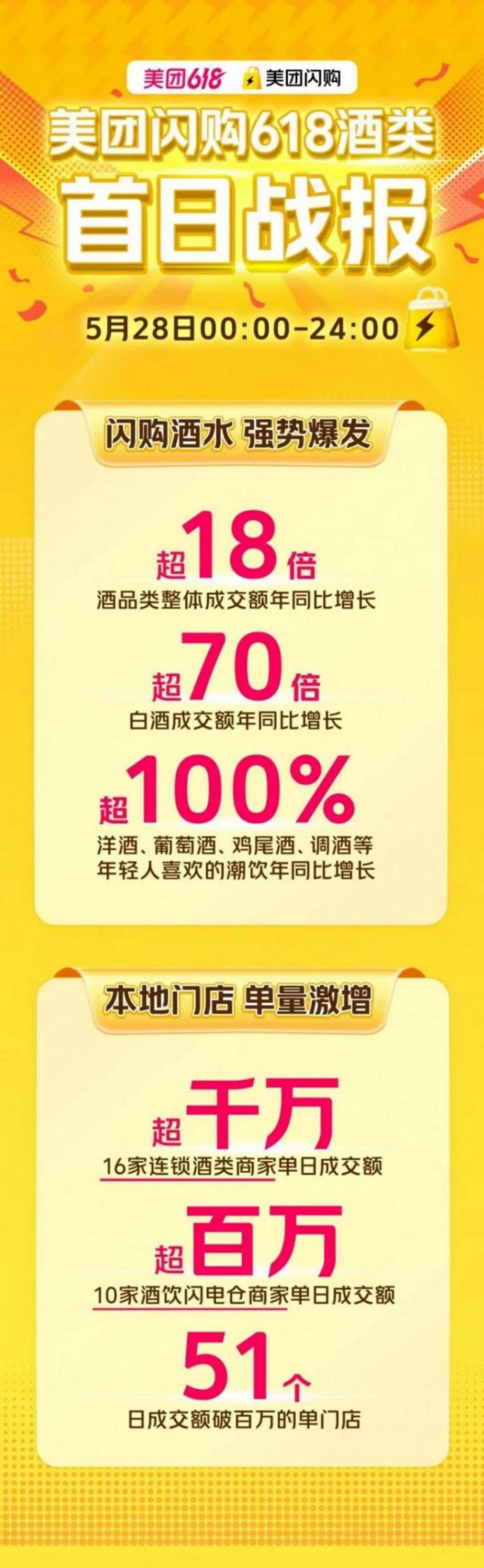 从5月31日到6月18日,京东超市酒类销售成交额同比增长80%,用户同比增长60%;5月13日到6月18日,天猫酒水核心品类成交同比大涨39.6%;5月27日至6月18日,美团闪购旗下歪马送酒成交额增长超3倍;1919酒类直供成交额增长近5倍。