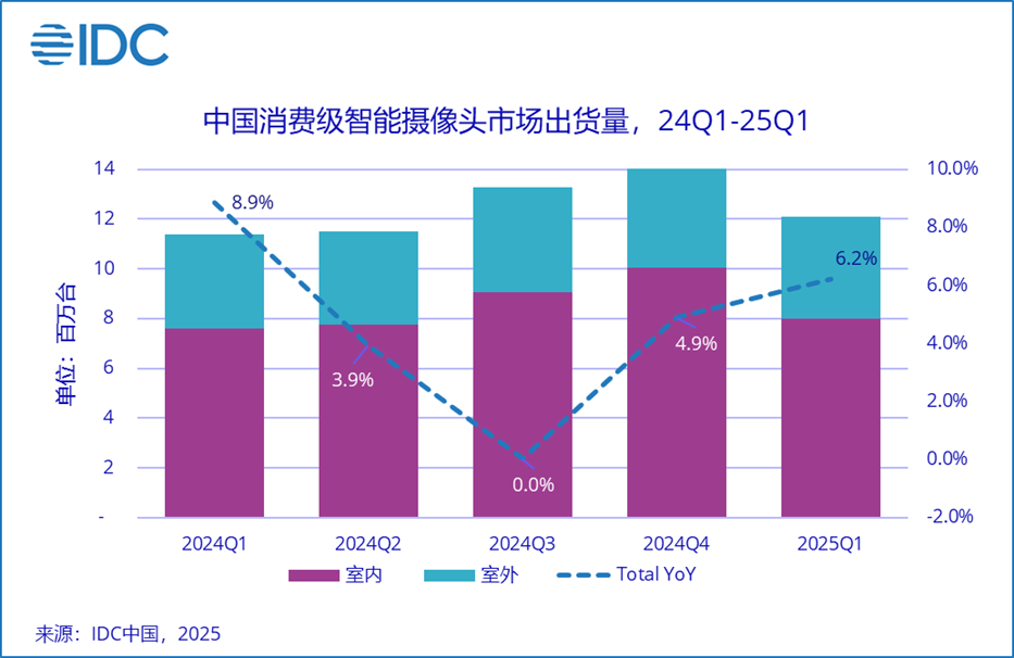 6 月 25 日消息,国际数据公司(IDC)今日发布的《全球智能家居设备市场季度跟踪报告,2025 年第一季度》显示,2025 年第一季度全球智能摄像头市场(包含消费级室内和室外摄像头,含运营商渠道)出货 3386.6 万台,同比增长 4.6%,增速持续放缓。