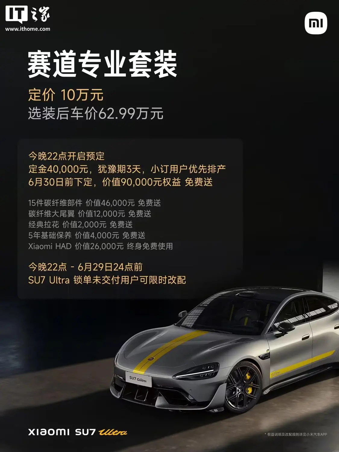 小米官方称,此前未行使小订优先交付权的原小米 SU7 Ultra 小订用户,在 6 月 29 日 24 点前下定小米 SU7 Ultra 选配赛道专业套装,支付定金 40000 元,并在犹豫期 3 天内锁单,可享优先排产权。