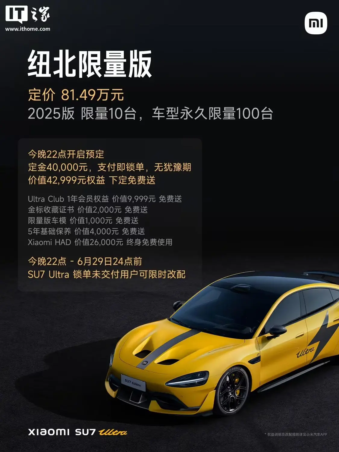 IT之家注意到,小米 SU7 Ultra 纽北限量版在 6 月 26 日的小米人车家全生态发布会上正式亮相,车型永久限量 100 台,2025 版限量 10 台,定价 81.49 万元。