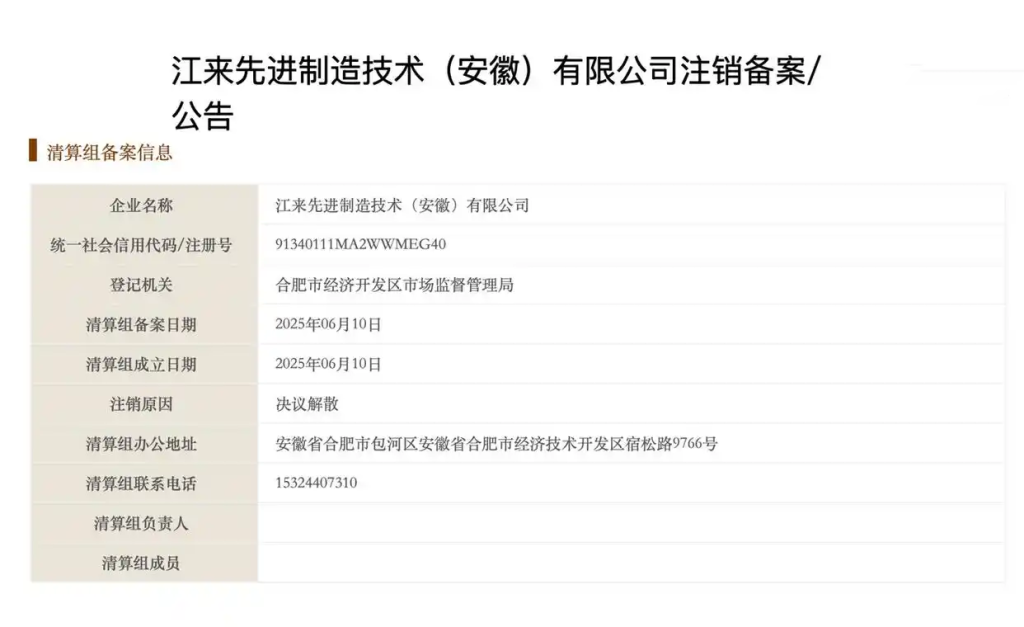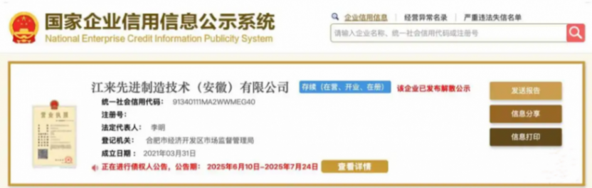 2025年7月7日,国家企业信用信息公示系统披露了江来先进制造技术(安徽)有限公司注销的消息,理由为“决议解散”,公告期从6月10日持续至7月24日。