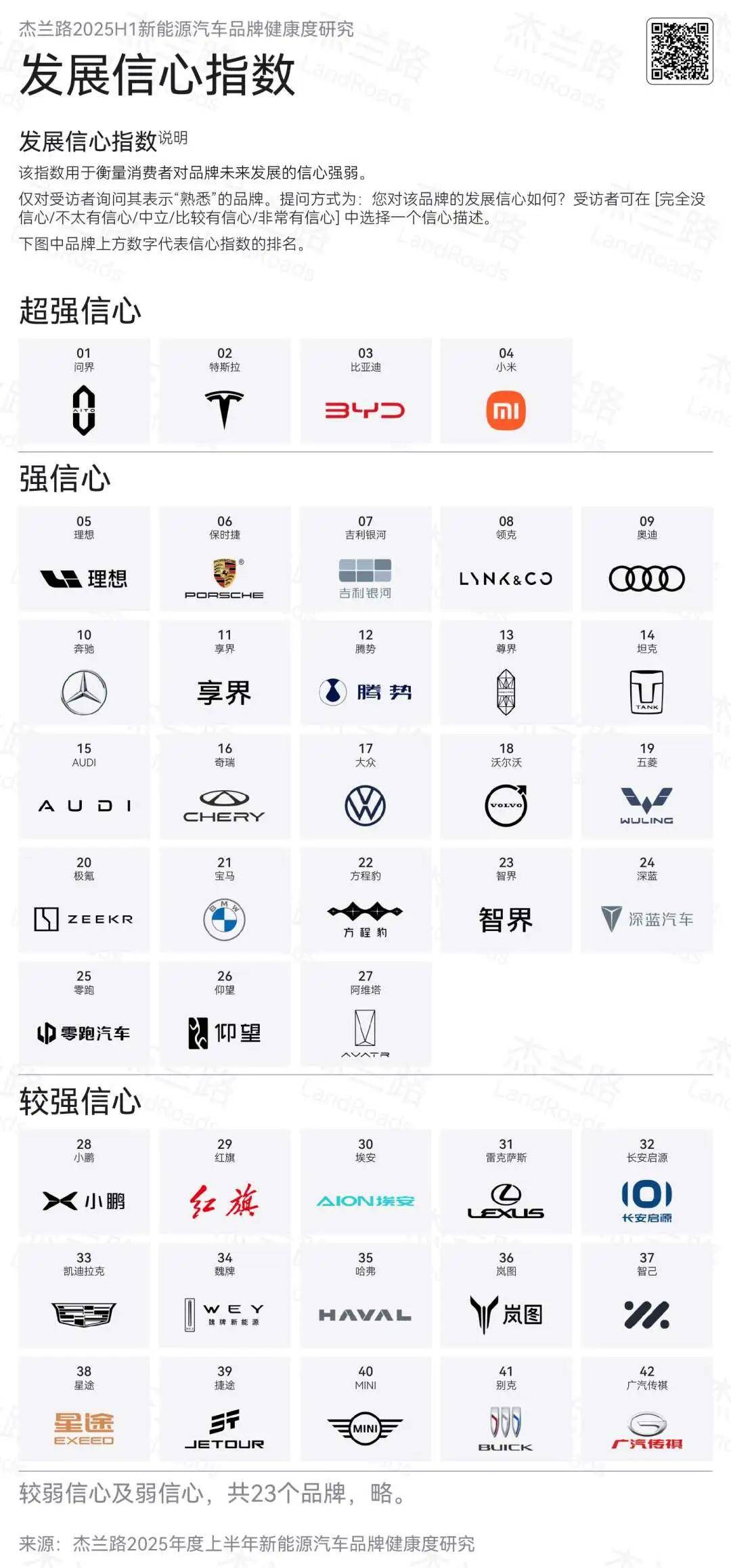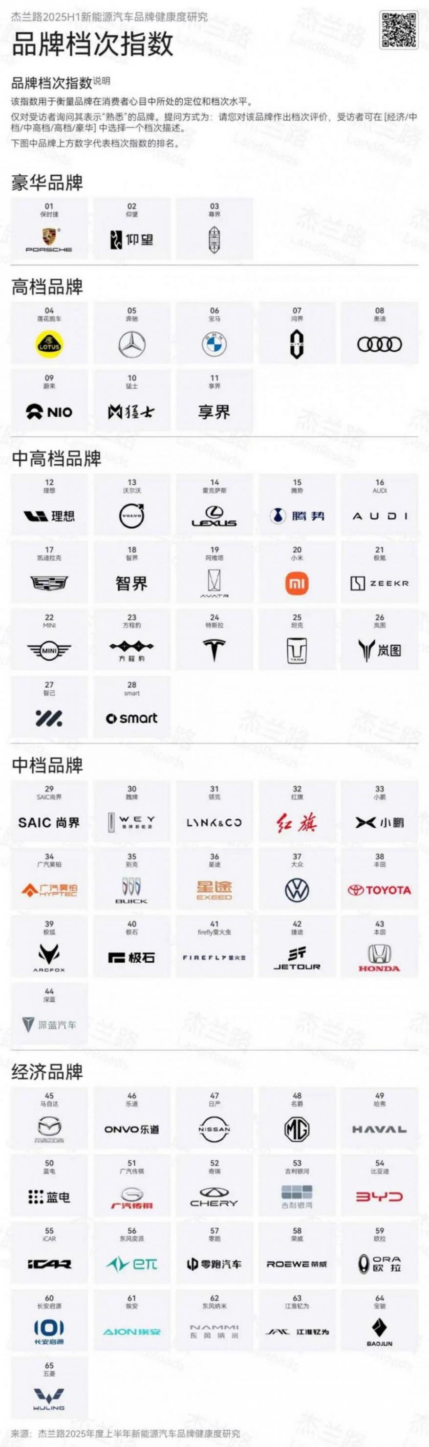 昨日,专注于中国汽车行业专业研究与咨询服务机构杰兰路,曾发布一份 2025 年新能源汽车品牌健康度研究报告,在这份研究报告里,杰兰路发布了多项公共指标统计。