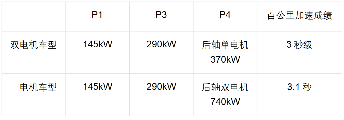 整体来说极氪9X会有双电机和三电机的两套动力总成,都是P13+P4的混动构型,具体的参数我给大家整理了表格,稍低一点的配50度的电池包,P3电机290kW,P4电机370kW,纯电续航超过300公里。高配的车型电池包升级到70度宁德时代逍遥电池,后轴双电机,最高功率直接拉到了1030kW,关键两套动力总成的百公里加速成绩都是3秒级。这里还要提及一点就是P1电机的发电功率也达到了145kW,这是什么概念?行业最高水准,所以哪怕是匮电的情况下,他们内部实测的百公里加速成绩也仅仅相差0.2秒的水准。