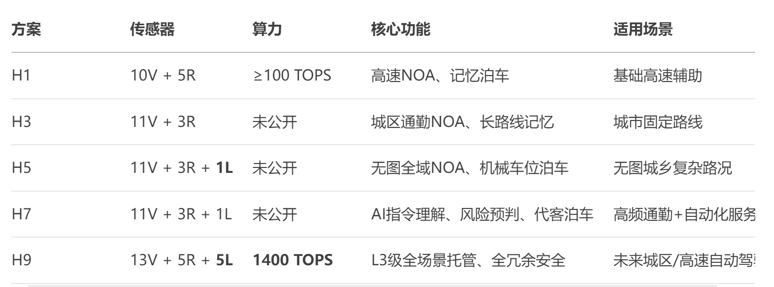另外,极氪9X会搭载浩瀚智驾的H7以及H9的两套方案,如果有不了解浩瀚智驾13579各个硬件差异的网友,我也把信息整理了表格给大家呈现一下,当然部分信息也没有公布太多。