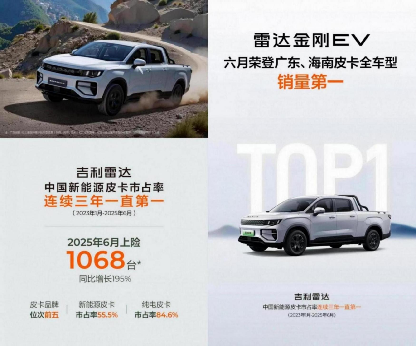 新能源皮卡到底行不行,一直是行业关注的焦点话题,如今数据给出了明确答案。最新上险数据显示,6月吉利雷达全系皮卡销量达1068辆,同比暴涨195%,以55.5%的市占率稳坐新能源皮卡头把交椅,其中纯电车型市占率高达84.6%,展现出统治级优势。
