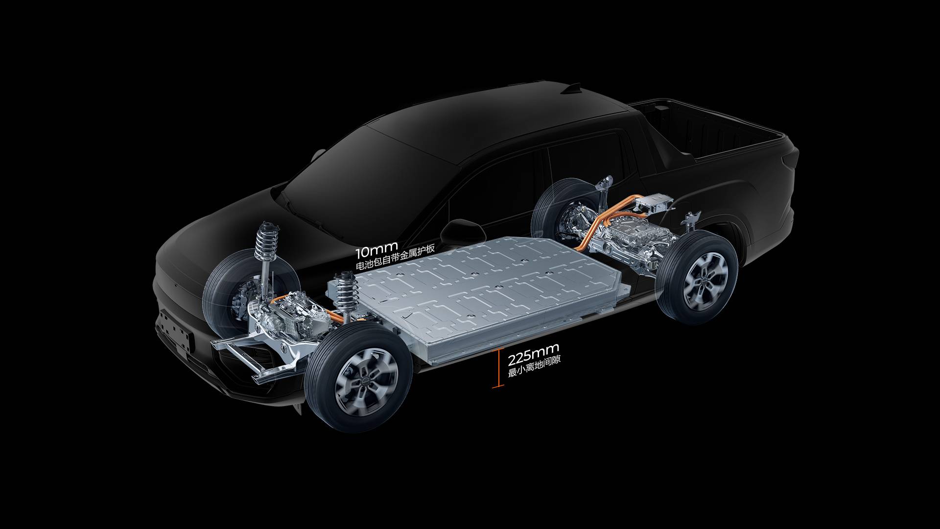 再来看性能层面,910kg额定载重超出燃油皮卡410kg,280kW功率达到传统燃油皮卡两倍输出,零百加速5.7秒(满载7.8秒)的闪电起步,满载比传统燃油皮卡空载快2秒;485N·m超大扭矩配合95%极限爬坡度,让建材运输车队在山区工地如履平地。