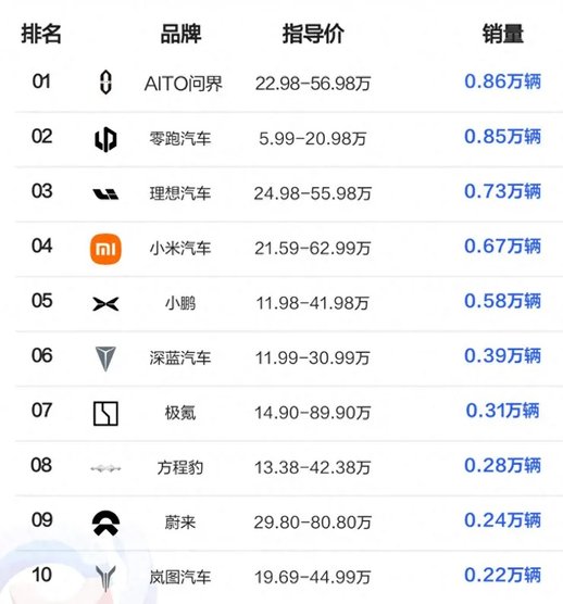 第十名、岚图汽车,销量 0.22 万辆,是东风汽车旗下中高级新能源品牌,产品力和市场接受度不错,排名第 10。