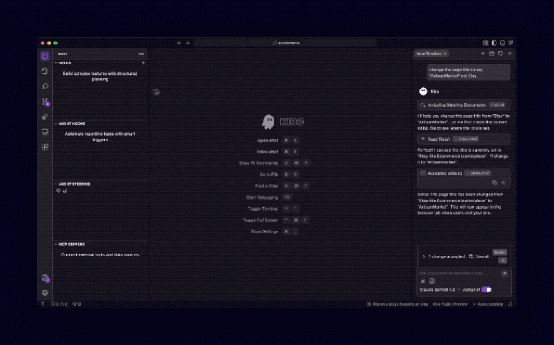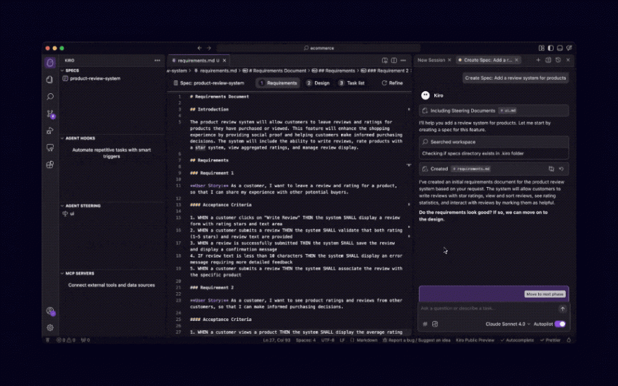 若是用一句话概括Kiro的亮点,那就是只要你有想法,它就能帮你把这个想法变成实际可用的软件,而且是从项目启动、设计、编程到最终维护,全程都有专业级的Agent深度参与。