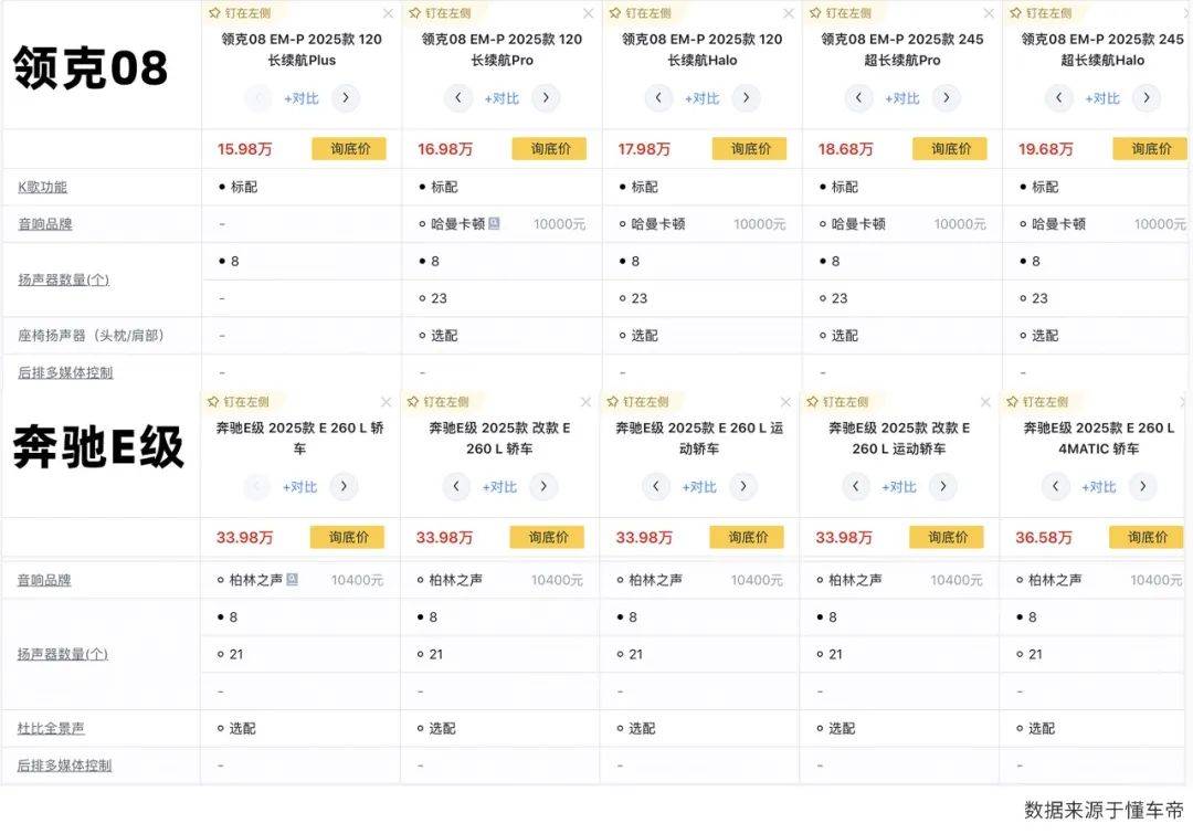比如领克08可以从标配普通音响升级为哈曼卡顿音响,奔驰E级可选装柏林之声音响,这些品牌升级的价值到底在哪里?