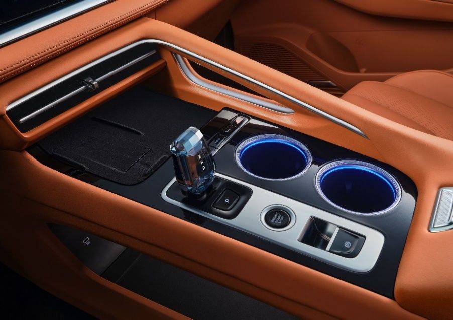 中控区域,拱桥承韵・扶手台中央控制区为“拱桥半包围”结构,保留常用功能实体按键,操作高效;3D镭雕・水晶挡把工艺精致,握持体验佳;窗影叠映・座椅采用“菱扇镂空”工艺,乘坐干爽。高山流水・音响氛围灯拥有同级最多12个发光区域,256色可调,支持呼吸、渐变、开门迎宾等九大功能,兼具氛围营造与贴心提醒作用。