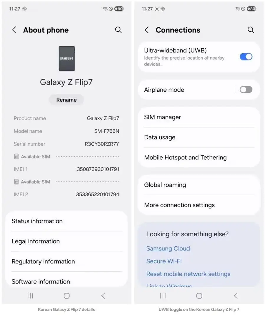 而且这并非错误,韩版Galaxy Z Flip7目前出现在谷歌Play控制台支持UWB的设备列表中。此外,通过三星远程测试实验室测试的韩国版设备在“设置”中的“连接”选项下显示有“超宽带(UWB)”的切换项,与其他配备UWB的三星手机相同。