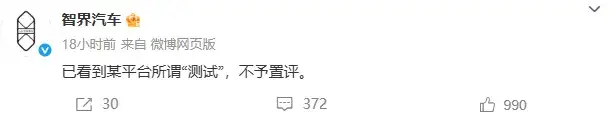 关于这场智驾测试,有两家车企率先表态了,一个就是奇瑞和华为联合打造的智界,它发了条微博,只有14个字——“已看到某平台所谓‘测试’,不予置评。”