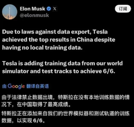 另一个就是远在大洋彼岸的特斯拉,其CEO马斯克发了个推文,一串英文总结下来就一句话:虽然我们没有中国的道路数据,但我们依旧拿了第一名。