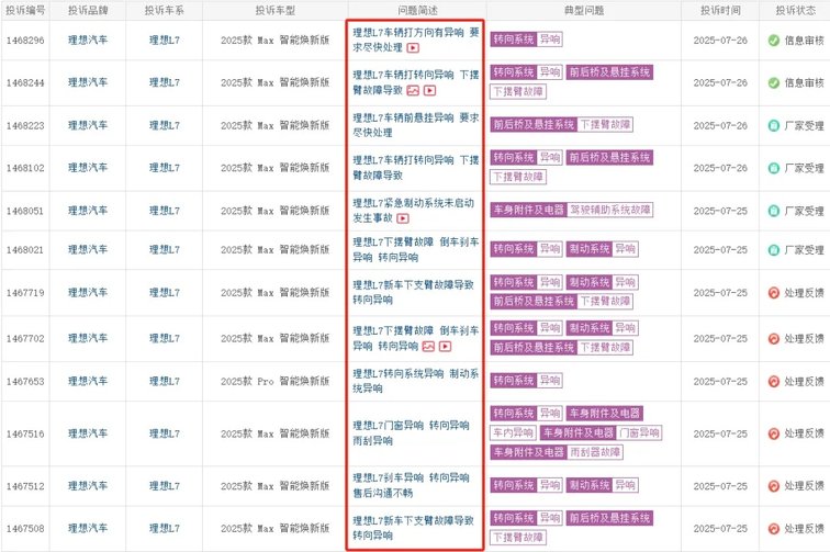近日,来自专业汽车投诉网站的消息,理想 L 系列爆出大问题,多位车主投诉车型下摆臂异响,涉及 2025 款理想L全系列 L6、L7、L8 和 L9,但理想MEGA并没有出现投诉。