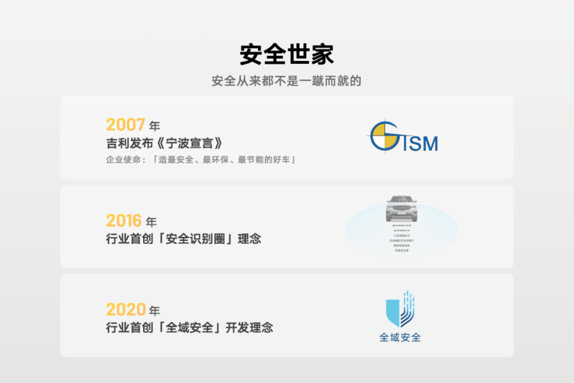 为什么吉利如此看重安全?本质上,这不是一种策略,而是一种根植于企业基因的造车观。过去30年,无论是早期苦练基本功的积累期,还是如今全面拥抱智能电动时代的转型期,吉利都从未在“安全”二字上打过折扣。无论是十多年前在《宁波宣言》中提出“造最安全的好车”,还是如今提出“安全平权”理念,吉利始终认为:让消费者买得起,也用得安心,是品牌的责任,更是对用户的尊重。这份坚守,没有花哨的修饰,却足够厚重。