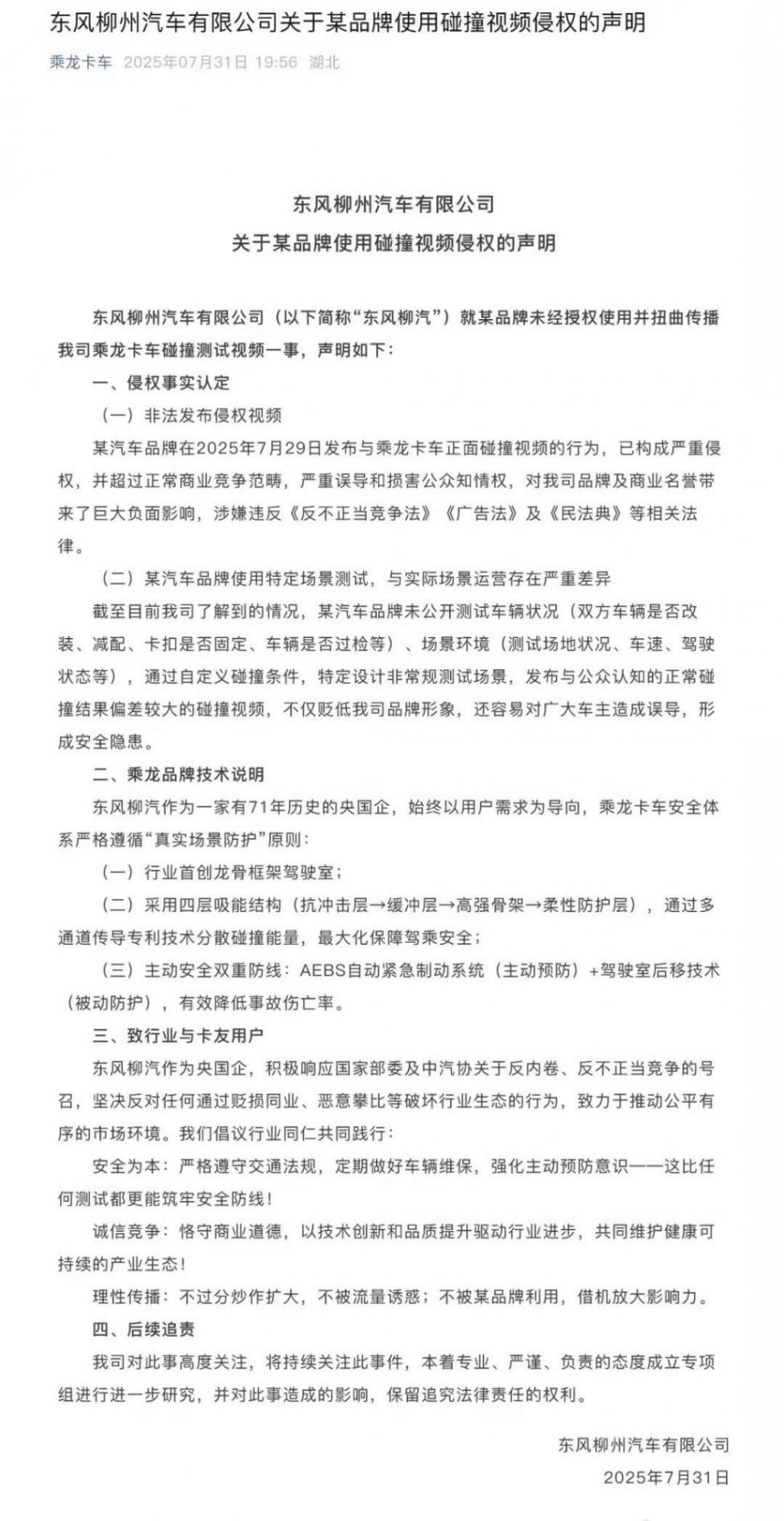 乘龙卡车的母公司,东风柳州汽车有限公司也在7月31日发布“关于某品牌使用碰撞视频侵权的声明”,表示:某汽车品牌在2025年7月29日发布与乘龙卡车正面碰撞视频的行为,已构成严重侵权,并超过正常商业竞争范畴,严重误导和损害公众知情权,对其品牌及商业名誉带来了巨大负面影响,涉嫌违反《反不正当竞争法》《广告法》及《民法典》等相关法律。