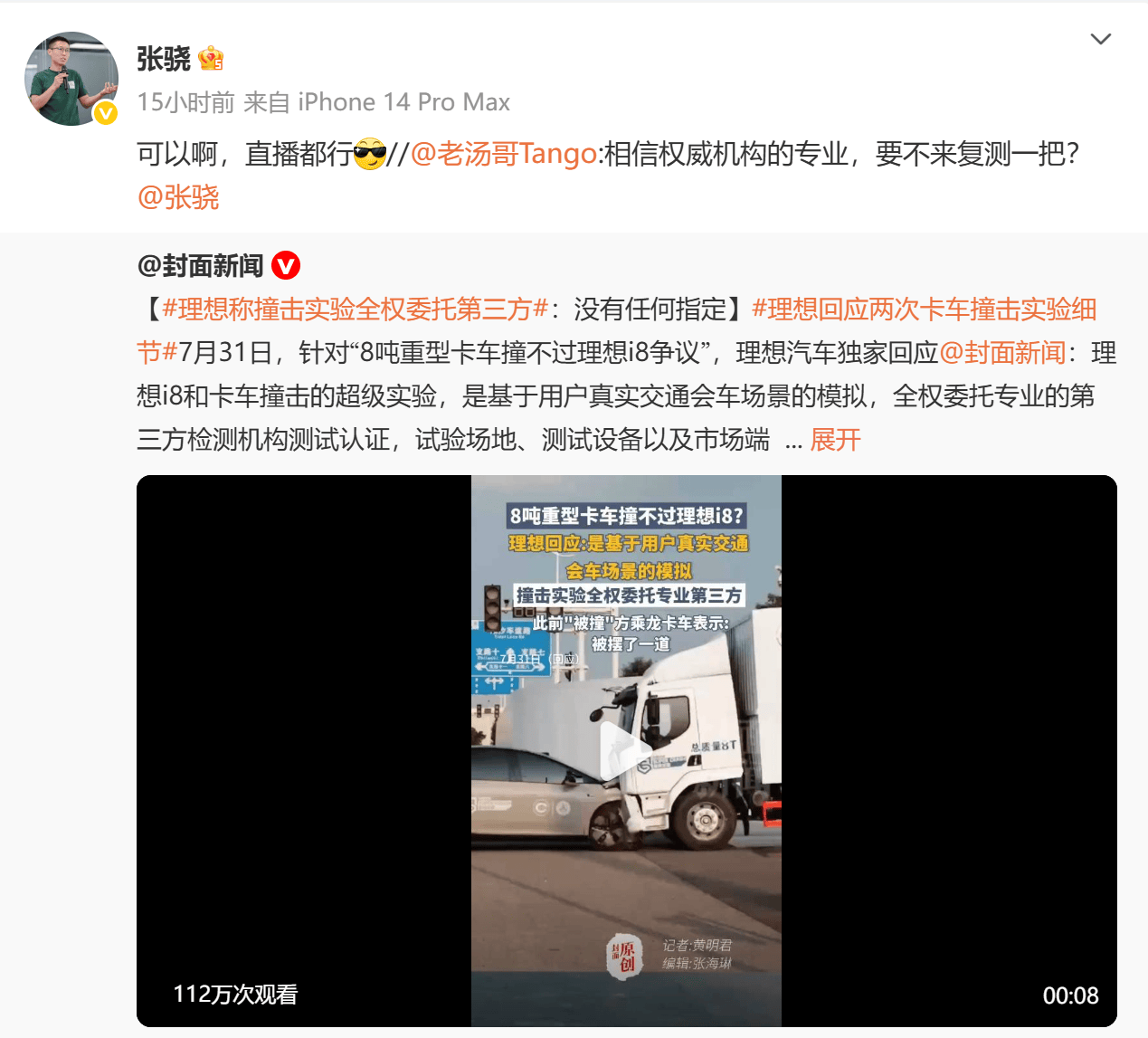 风波未平,理想汽车产品负责人公开表示可“直播复测”。且不说这种直接将复杂安全体系简化为“胜负对比”的做法本身就存在争议。作为车企高管,产品负责人,是不是更应该清楚,车辆的每一项安全设计都不是为了在对撞演示中“取胜”,而是为了在真实道路事故中挽救驾乘人员的生命呢?