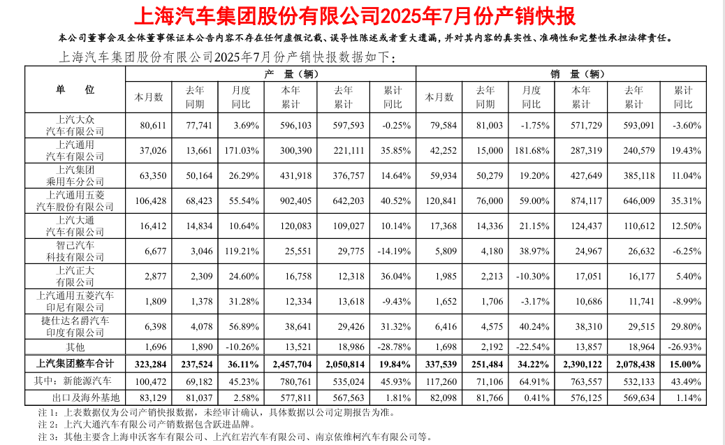从上汽集团发布的最新产销快报来看,集团7月销量达33.8万辆,同比增长34.2%,实现了月销“七连涨”,1-7月累计销量达239万辆,同比增长15%。
