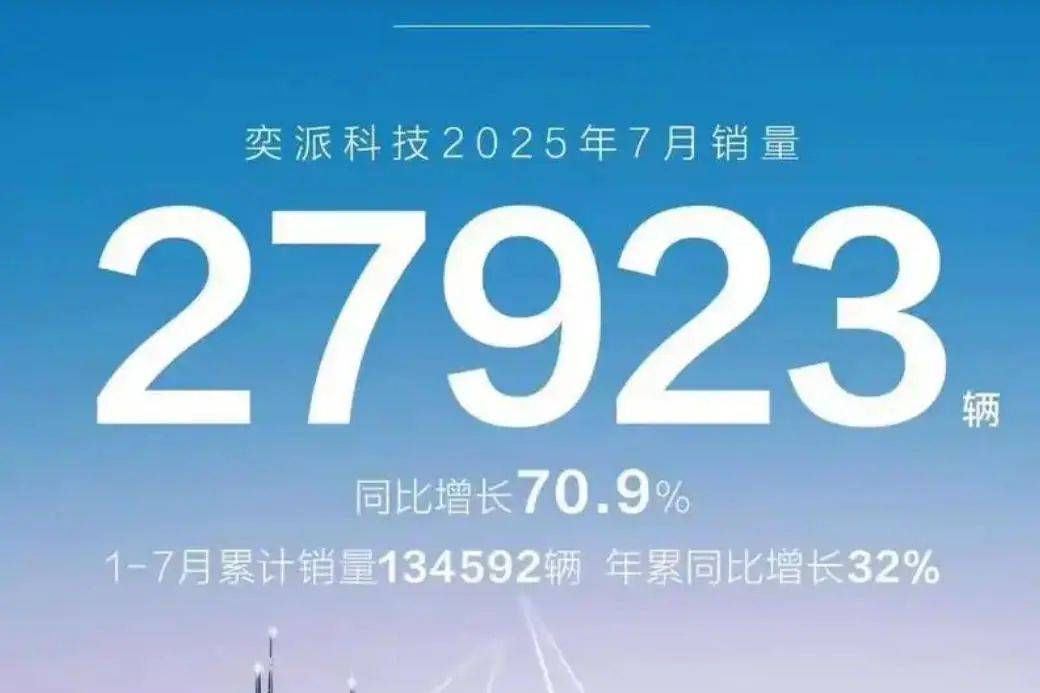 奕派科技(涵盖、东风奕派、东风纳米)7月销量达27923辆,同比增长70.9%;1-7月累计销售13.46万辆,同比增长32%,增长势头强劲。