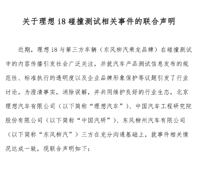 随着理想、东风柳汽、中国汽研三方发布联合声明,理想i8碰撞事件也算告一段落了。不过,虽然这场闹剧已经迎来了“大结局”,但理想的“舆论危机”却没停。