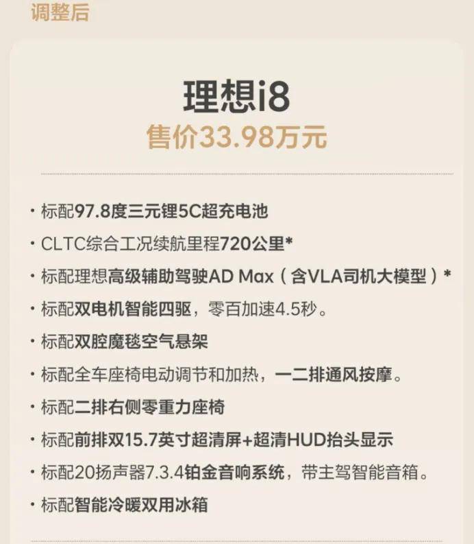 这几项叠加之后,表面上看似是三款配置缩成了一款,实际是理想用一款配置满足了三个档次的需求。显然,这次“听劝版”的推出,带来了两个最直接的影响:比起以前流行的高中低配置划分,理想i8进一步适应了这个“怕麻烦”、追求一步到位的时代,统一的配置减少了用户的选择成本和销售的解释成本;同时,增配降价的举动,也让人进一步感受到了理想i8的诚意。