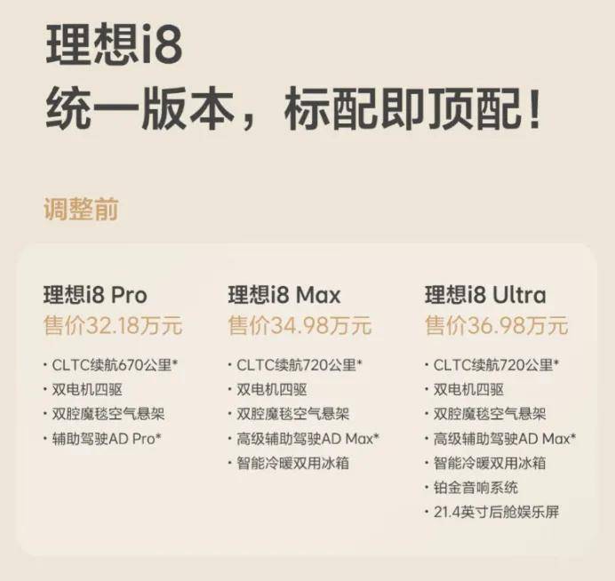 先来说说这次的配置调整,用尽量直白易懂的方式表述,那就是在大多数人都选择Max、Ultra而非Pro(入门版)版本的前提下,理想直接给主力车主让利,把之前的Max版本变成了性价比更高且无需纠结的“听劝版”。