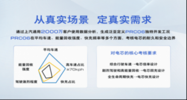 首先基于上汽通用2000万客户的“真实用车场景“数据,泛亚构建了映射真实需求的”行业最严苛测试标准“PRC06泛亚开发工况,该工况围绕平均车速、高车速占比(≥70km/h工况占比)、快充使用占比、驾驶激烈度(加速/制动频率)、能量回收强度这五大维度锚定电芯考核边界,比行业标准的CLTC工况要严苛很多。
