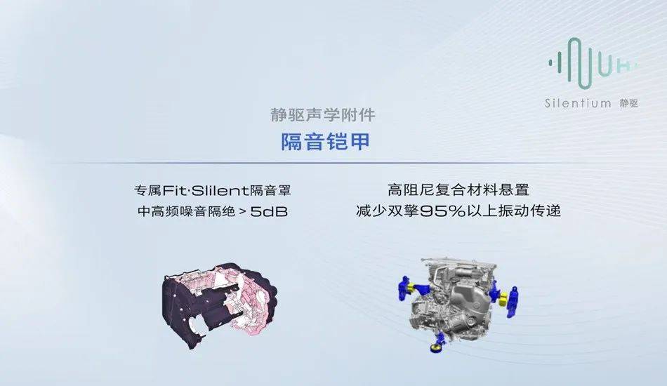 首先从源头让噪音轻下来,通过高效燃烧系统精准控制、搭载增程专属加厚缸体、进气歧管结构加强及带阻尼减震的前罩盖,成功地让发动机整体噪音降低了1.6dB;并通过发电机与发动机同轴一体式设计,让增程系统启停时振动降低>25%,从而实现了无感化介入;