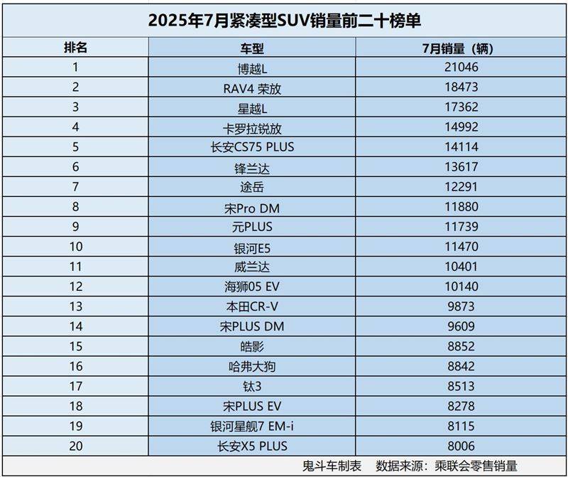 此外,进入前二十销量榜单的车型还有哈弗大狗、方程豹钛3、宋PLUS EV、银河星舰7 EM-i、长安X5 PLUS,7月份,这些紧凑型SUV零售销量都在8000辆以上。