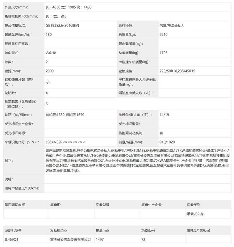 如果单从命名上看,深蓝L06会是一款定位低于深蓝L07的产品。然而从申报信息上看,深蓝L06的车身三围分别为:4830/1905/1480mm,轴距2900mm,同样定位中级轿车。作为参考,深蓝L07的车身三围分别为:4875/1890/1480mm,轴距2900mm。深蓝L06相比L07,车长稍短,车宽更宽。这意味着深蓝L06在外观视觉上会呈现出跑车的宽体低趴效果,“跑味”更足。而两车的车内空间表现预计相差不会太大。