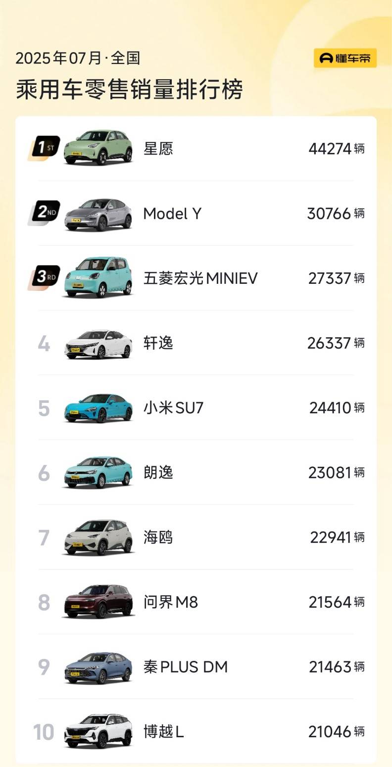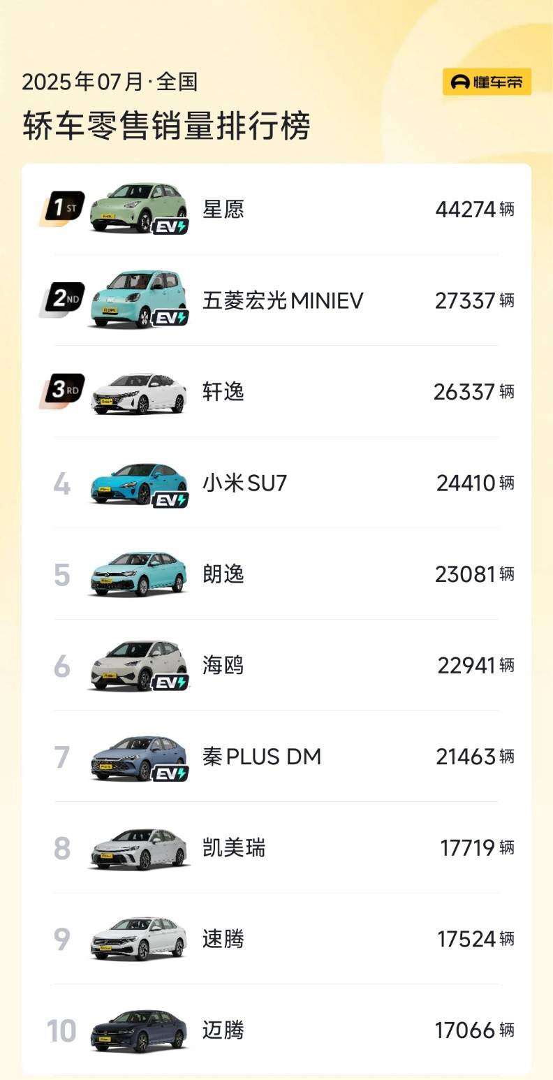 轿车TOP10呈现新能源与燃油车平分秋色的局面,但新能源车在排名上更靠前。吉利银河星愿、宏光MINIEV分列前两名,小米SU7、海鸥、秦PLUS DM的月销量都超过了2万辆。