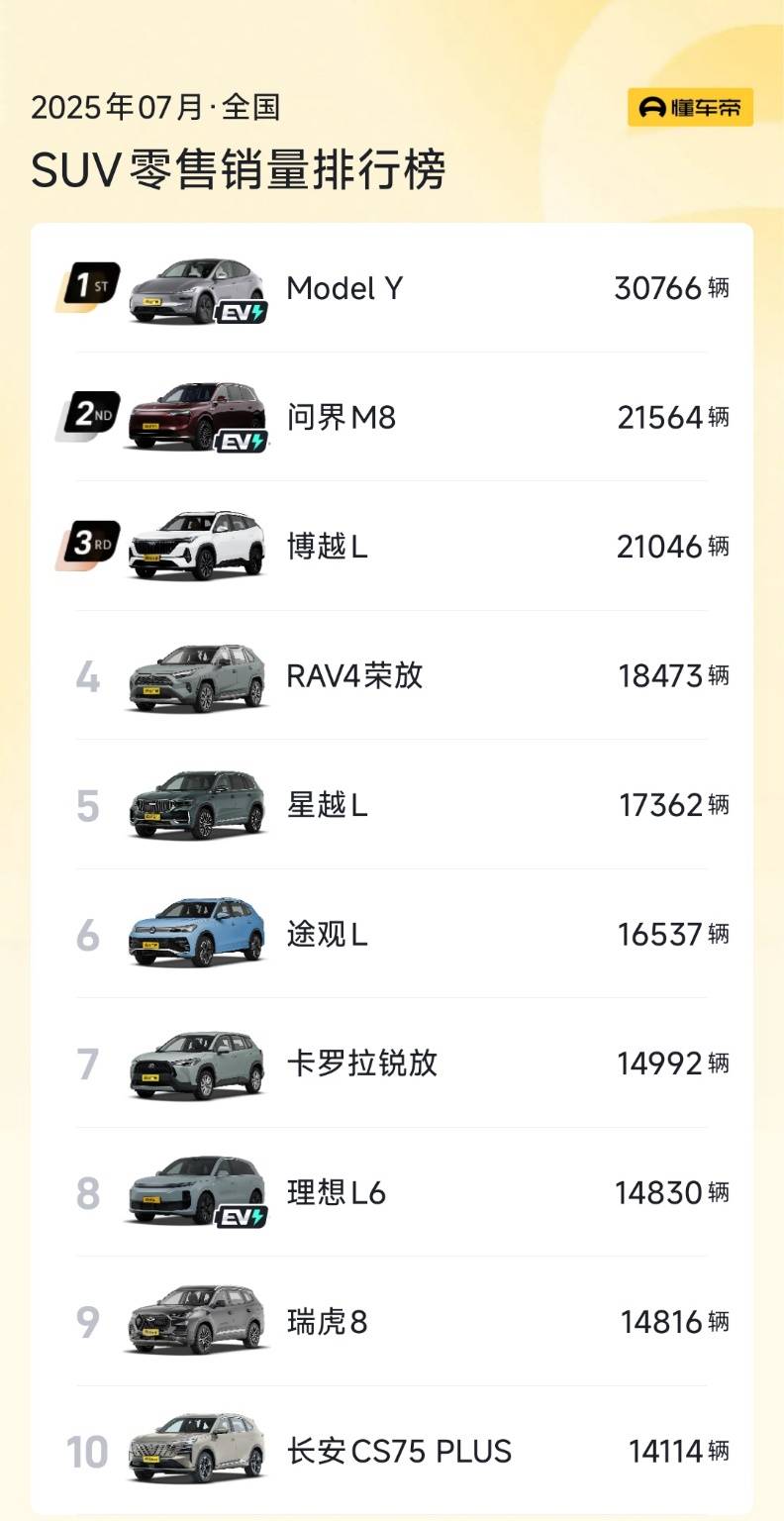 SUV榜单呈现的市场趋势稍有不同,尽管特斯拉Model Y和问界M8分别以月销30766辆和21564辆的成绩分列前两名,但燃油车在TOP10中占据了七席,说明在SUV市场传统燃油车依然受到认可。