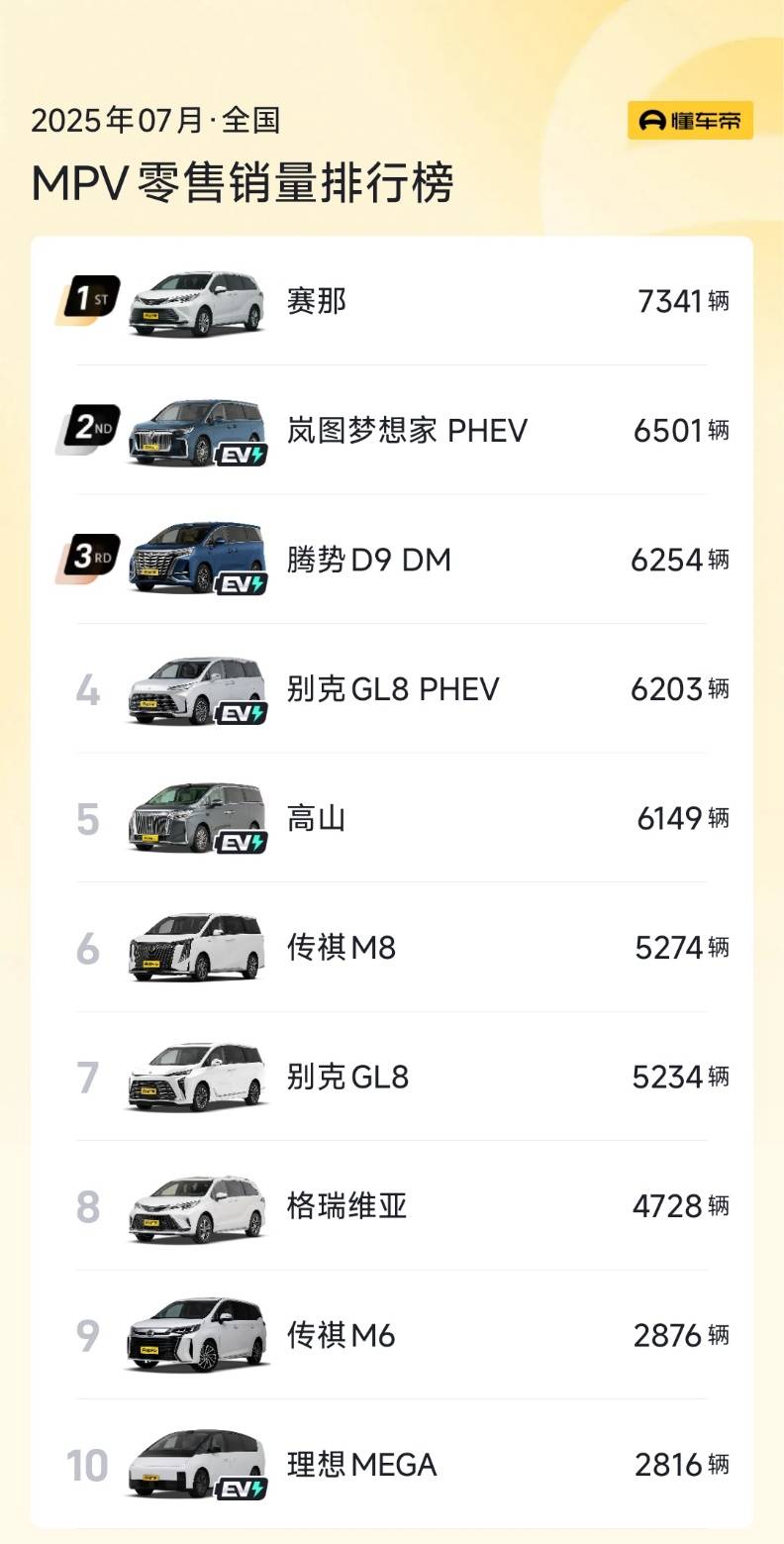 MPV市场排在榜首的终于是燃油车了,赛那以月销7341辆的成绩力压群雄,不过在TOP10的榜单中新能源车依然占据了六席。