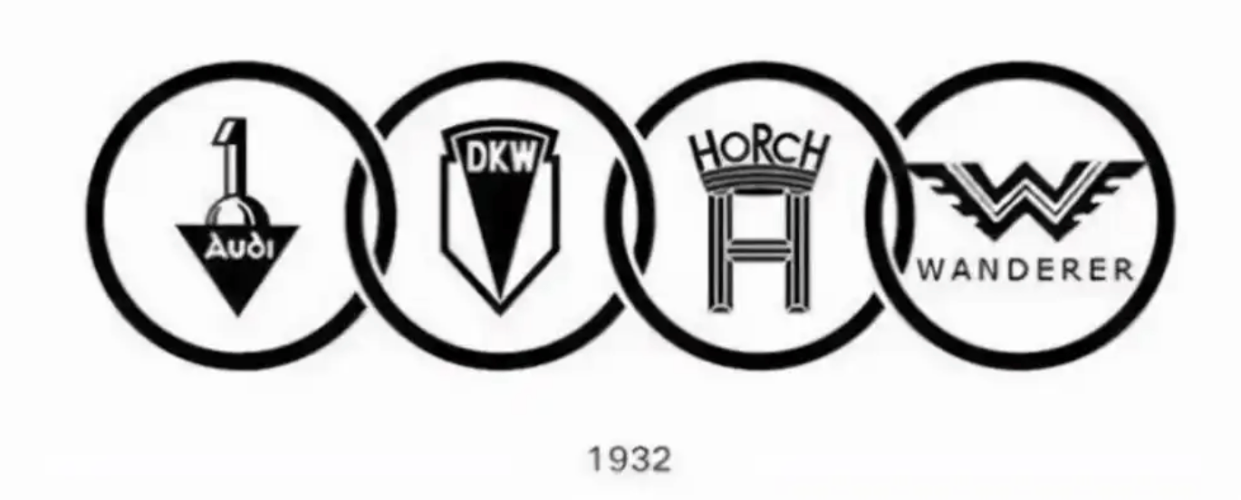四环标志是奥迪最经典的品牌符号,它的诞生可追溯到1932年。当时,奥迪(Audi)、霍希(HOECH)、DKW和漫游者(WANDERER)四家位于德国萨克森州的汽车制造商合并,成立了汽车联盟公司(Auto UnionAG),成为德国第二大机动车制造集团,如今的奥迪公司便以此为根基。