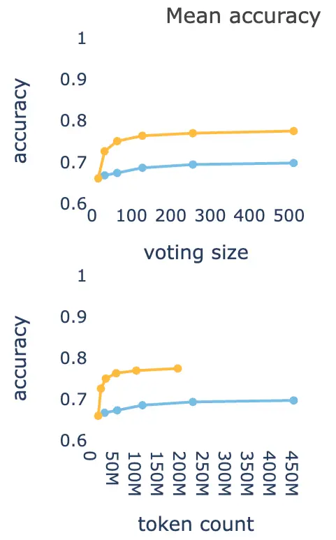 表明DeepConf在相同投票规模下能达到更高的准确率。