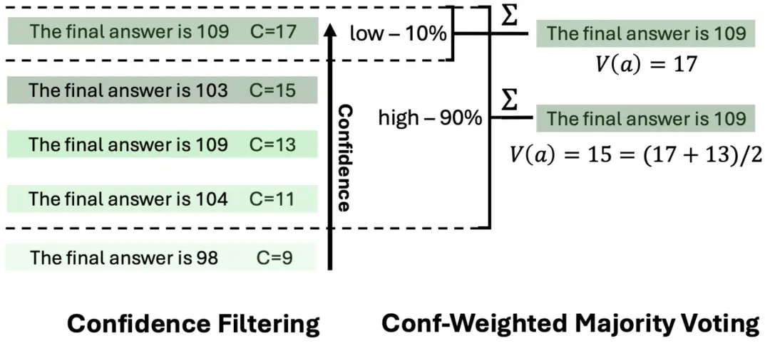 在加权多数投票的基础上,还需要应用置信度过滤,才能在将投票更集中于高置信度的推理路径。