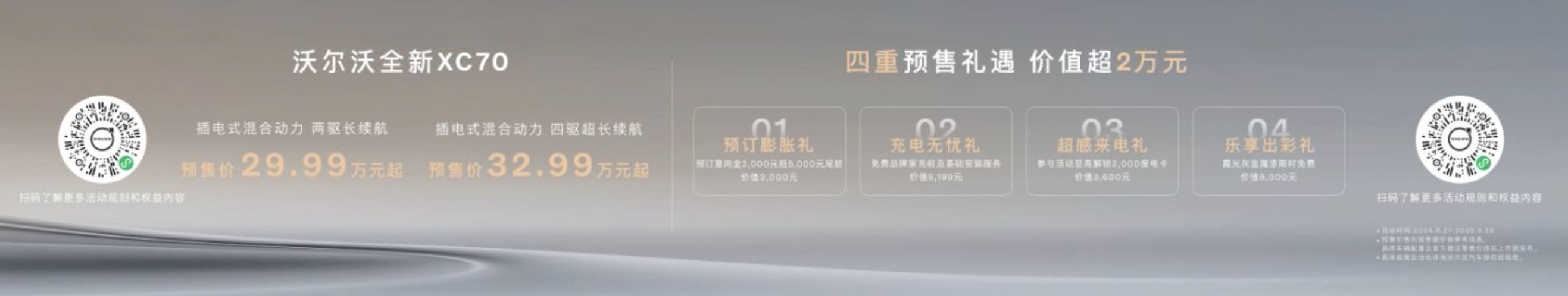 2025年8月27日,成都车展前夕,万众瞩目的沃尔沃全新XC70以全球首发的姿态惊艳亮相,正式开启预售。预售价29.99万元起(两驱长续航版),四驱超长续航版32.99万元,新车将于9月26日震撼上市。作为品牌首款基于SMA超级混动架构打造的车型,XC70不仅精准填补了XC60与XC90之间的市场空白,更以颠覆性的技术创新、极致的北欧美学、全方位的安全守护和智能体验,重新定义了豪华超混SUV的价值维度,成为电气化浪潮中兼具先锋实力与人文温度的标杆之作。
