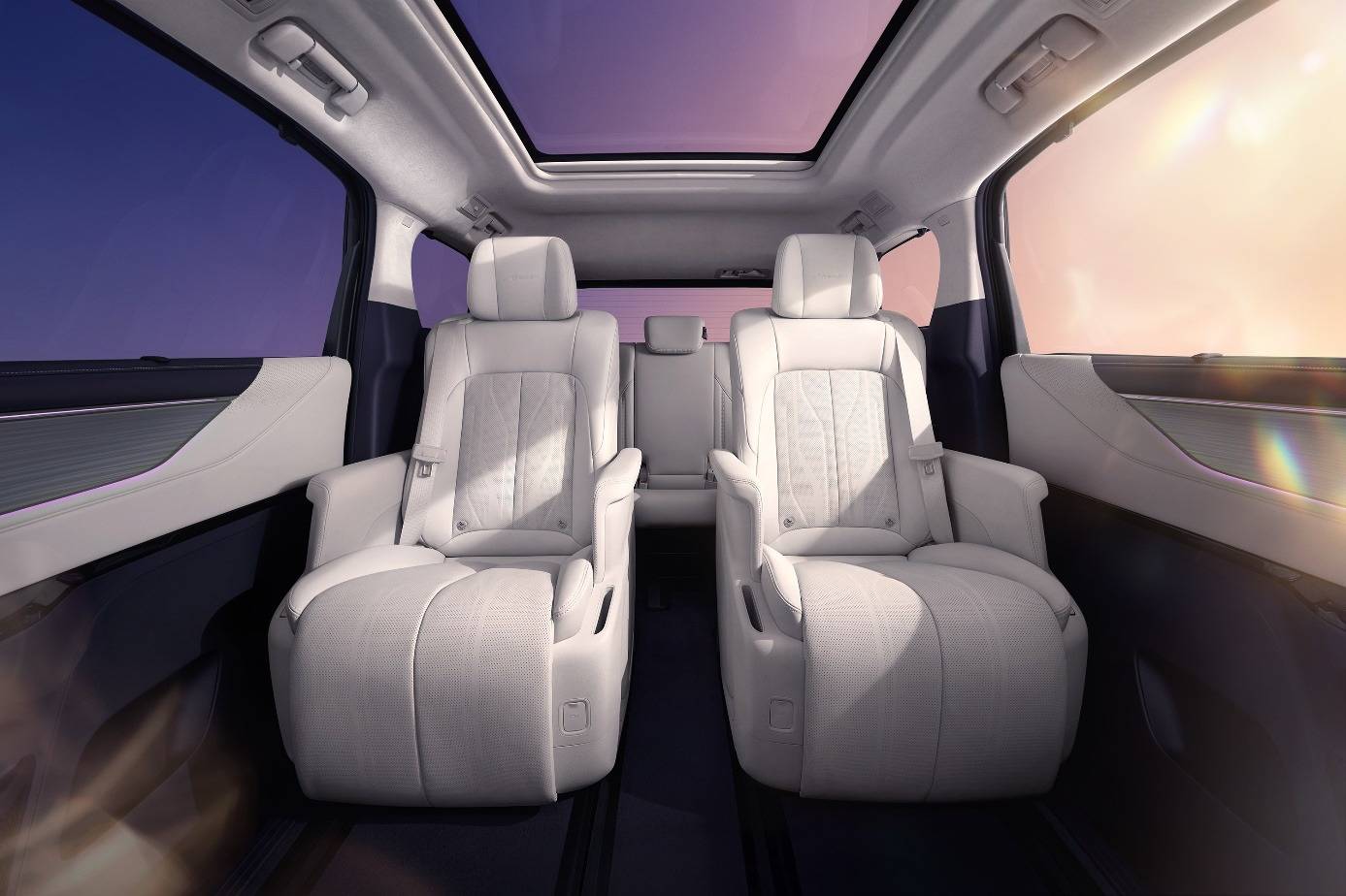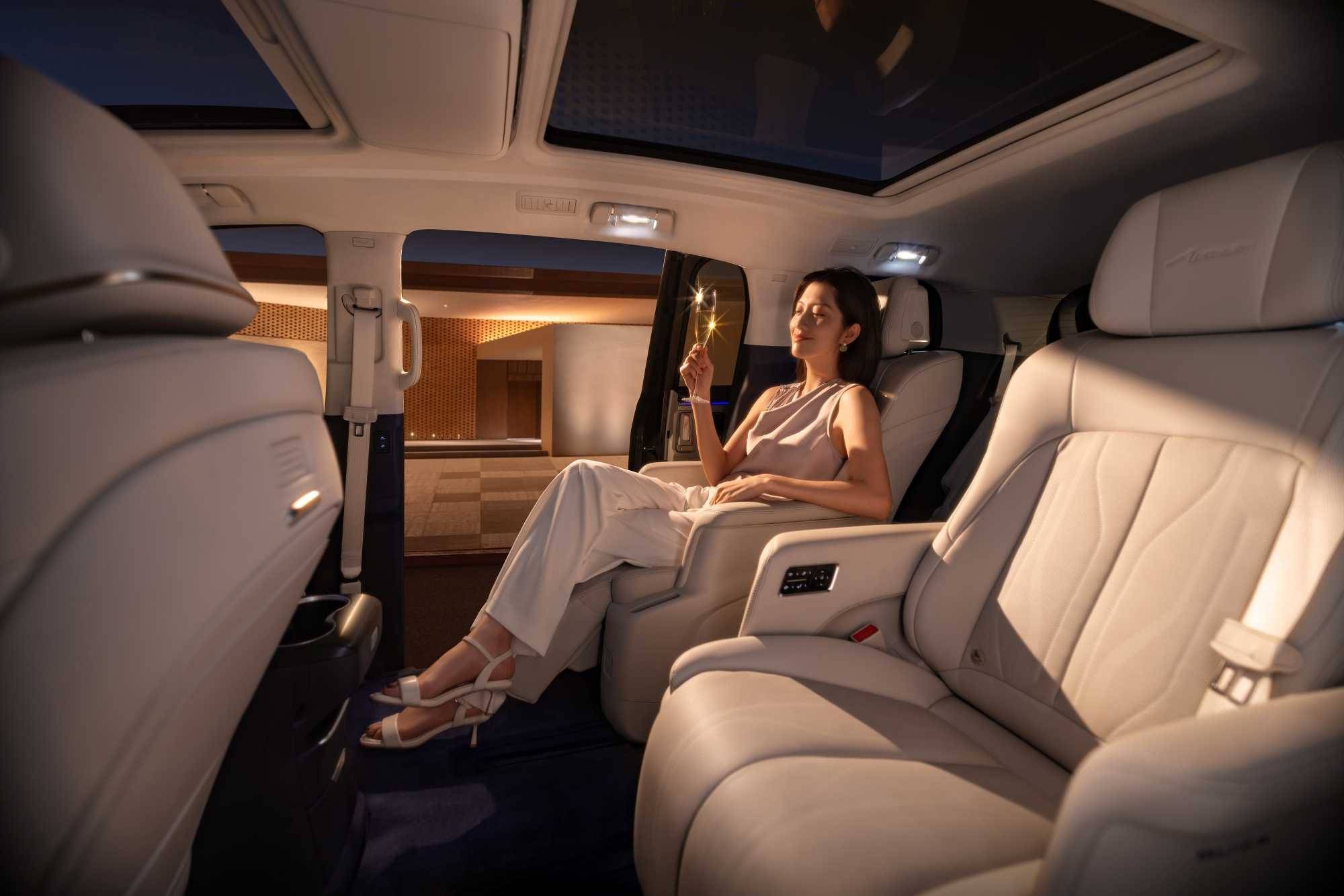 内饰新增“霞紫月白”配色,以极简线条、撞色设计及“向上生长”绗缝花纹演绎东方美学。车顶采用超细纤柔麂皮绒,触感温润,视觉高级。车门配备Smart Touch光感触控板,集成多种功能。全车三排座椅均包覆北美Nappa真皮,触感细腻。同级唯一带冷暖箱的礼宾灵动岛台支持260mm前后滑移,兼顾实用与美观。脚部区域铺设澳洲进口13mm高绒羊毛垫,进一步提升豪华舒适体验。