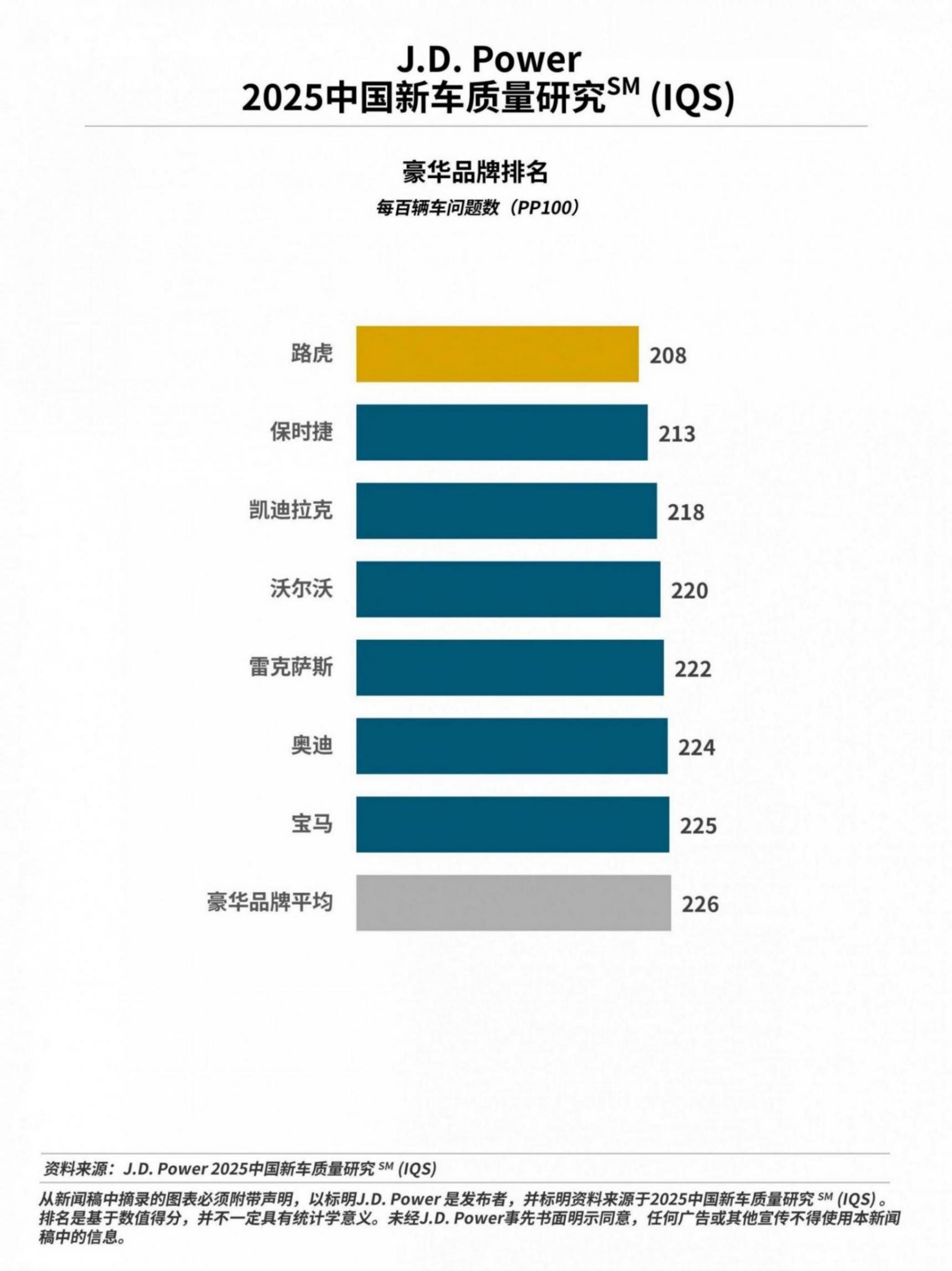 路虎(208个PP100)排名豪华品牌新车质量第一。保时捷(213个P100)和凯迪拉克(218个PP100)分别排名豪华品牌第二和第三。