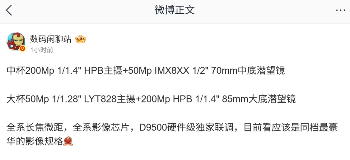 9 月 3 日消息,博主 @数码闲聊站 今天在微博透露,某厂的联发科天玑 9500 芯片新机将是“独家联调”,全系标配长焦微距、影像芯片,应该是“同档位最豪华的影像规格”。
