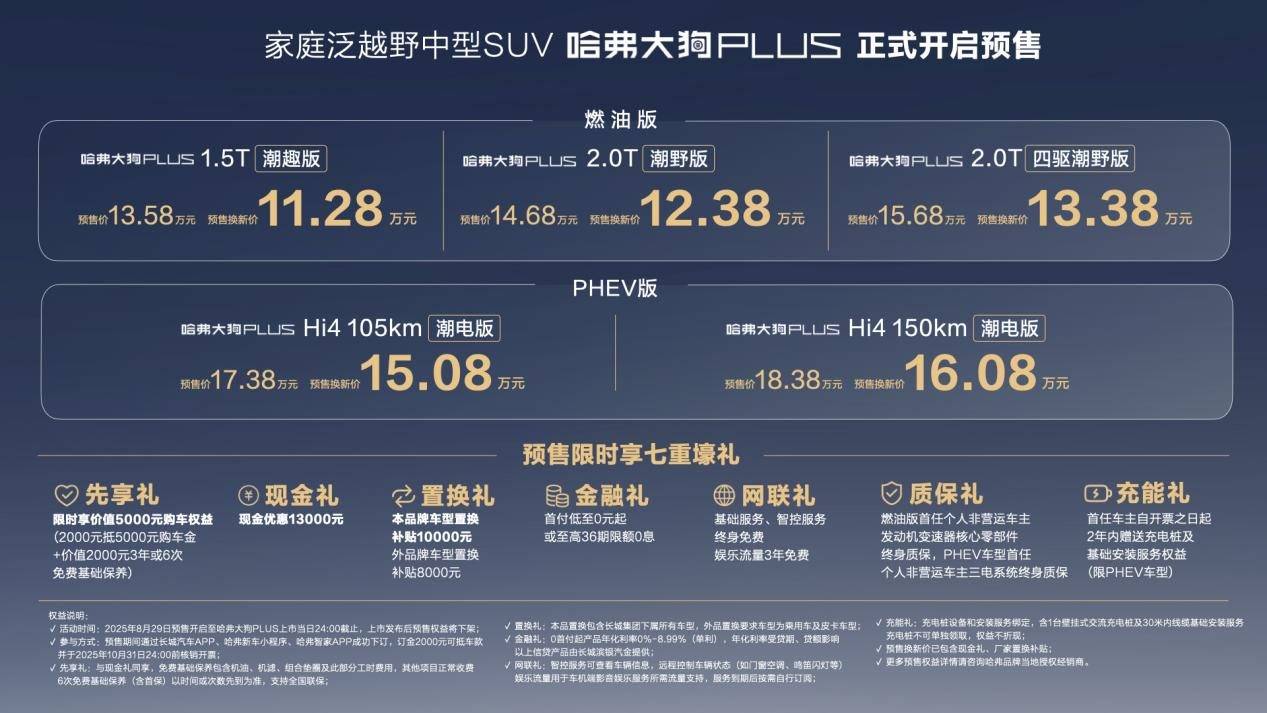 在8月29日开幕的成都国际车展上,哈弗大狗PLUS正式开启预售,目前共推出5款配置车型,预售价格区间为11.28-16.08万元。同时,哈弗旗下哈弗猛龙2026款、二代哈弗枭龙MAX等车型也一同亮相。