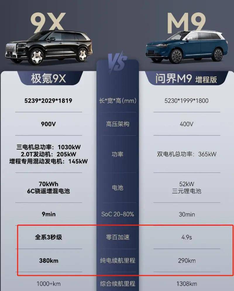 其实不止与传统豪华车型相比,就算与同为 “国产豪华 SUV” 的问界M9以及相比,极氪9X同样具备明显优势。虽然问界M9凭借“增程式”动力解决了续航问题,但在性能上极氪9X的三电机总功率1030kW比问界M9的双电机365kW强太多,380km的纯电续航也远超问界M9的290km。