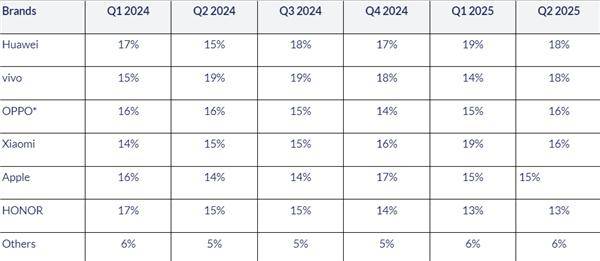 具体到品牌来看,华为市场份额为18%,新推出的nova 14系列需求强劲,同比增长18%,相比较2024年第2季度,同比增加了3%。
