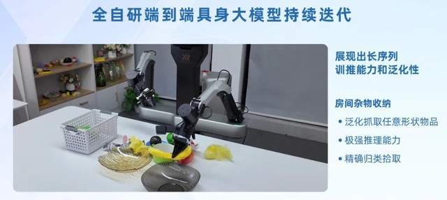 所以在收拾餐桌这个任务中,它执行起来并没有固定的顺序,说先做什么、后做什么,都是在一个长程任务里面,把各种子任务给穿插起来。人其实很难划分每个任务的边界是什么,这种任务就得靠模型端到端自主去决策、实时去规划,把整个任务完全做完的。