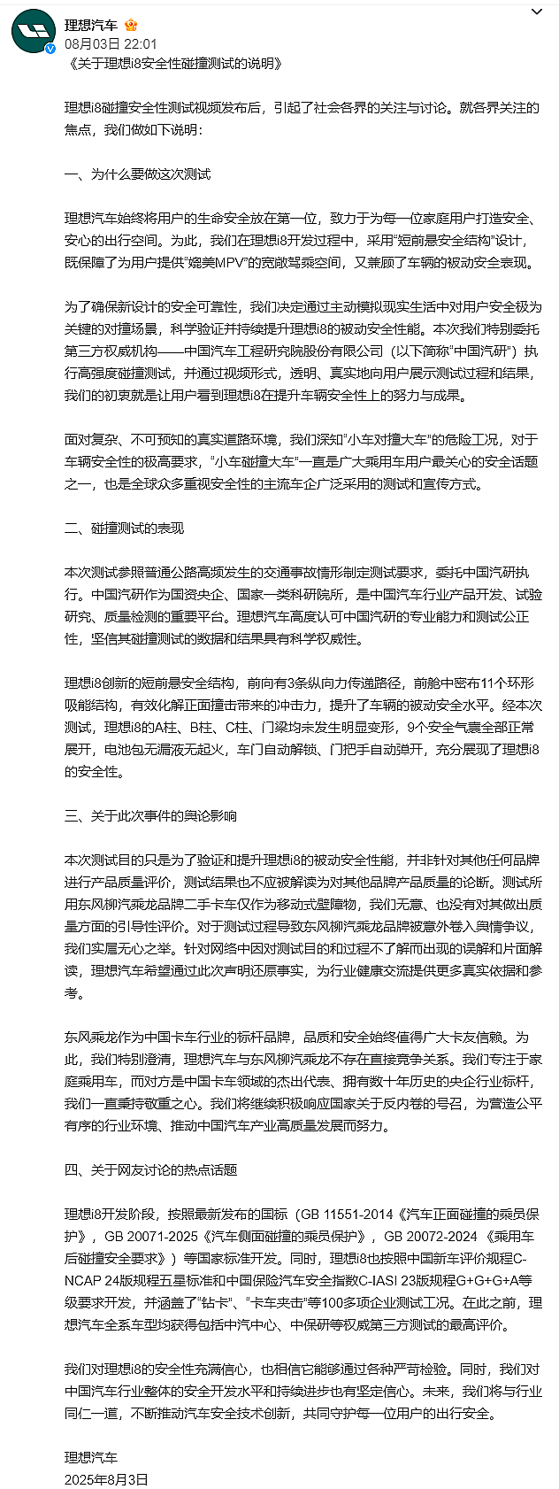 重点在于针对网络中因对测试目的和过程不了解而出现的误解和片面解读,理想汽车通过此次声明还原事实,为行业健康交流提供更多真实依据和参考。