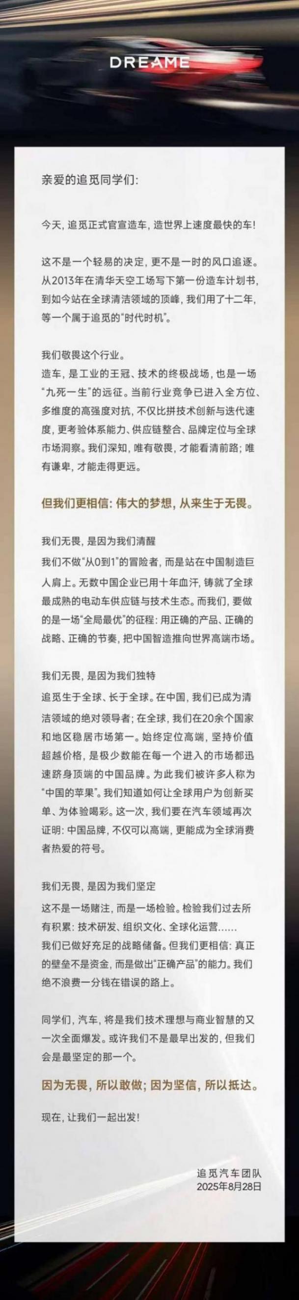 刚刚,追觅官宣造车,首款超豪华纯电产品直接对标布加迪威龙,2027年亮相。