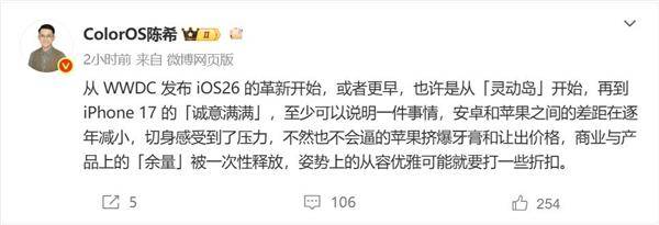 9月11日消息,ColorOS设计总监陈希发文指出,从WWDC发布iOS 26的革新开始,或许更早,也许是从灵动岛开始,再到iPhone 17的诚意满满,至少可以说明一件事情,安卓和苹果之间的差距在逐年减小,切身感受到了压力,不然也不会逼的苹果挤爆牙膏和让出价格,商业与产品上的余量被一次性释放,姿势上的从容优雅可能就要打一些折扣。
